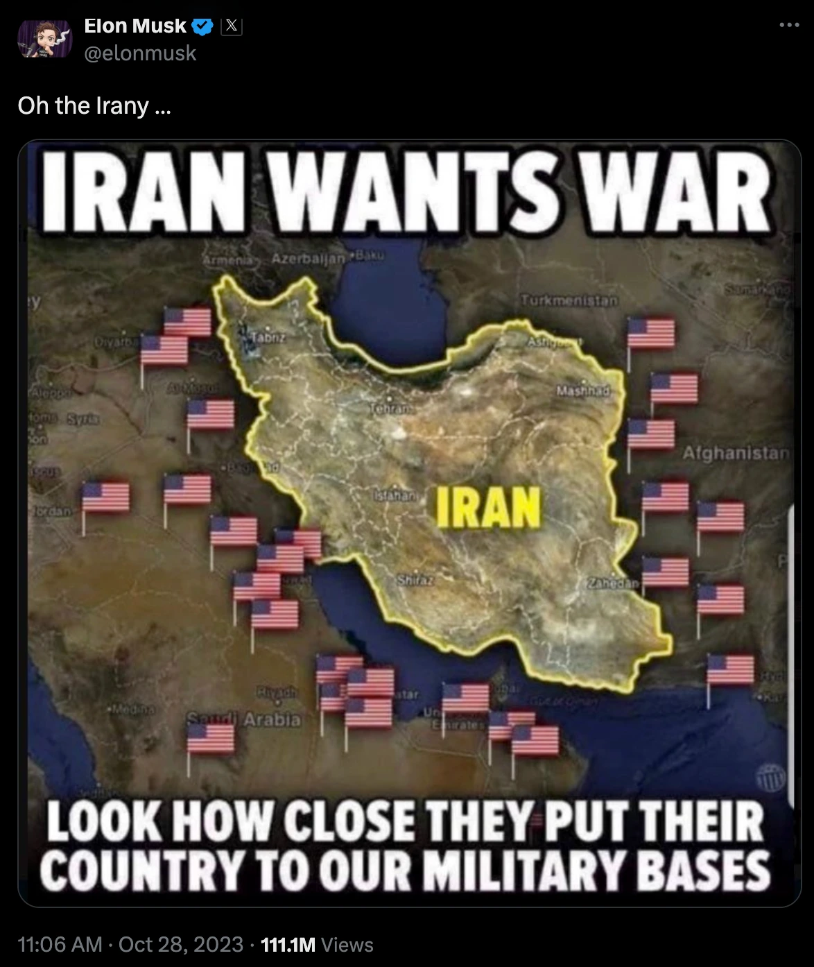 - REFERENCEElon Musk on X— "Oh the Irany …" — viral tweet showing US bases surrounding Iran (111M views, Oct 2023)